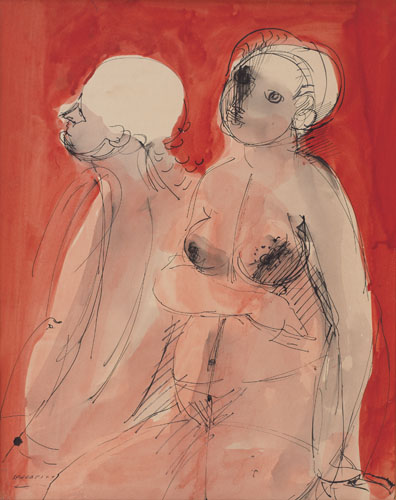 LEONARDO SPREAFICO Monza (Mi) 1907 - Milano 1974 Figure tempera e acquerello su carta applicata su tela cm. 57x46, firma in basso a sinistra.