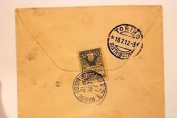 SAN MARINO - 1912, Stemma 15 c. fondo giallo (50) al verso di bustina per Torino, 17/7/12.(LETTERA)
