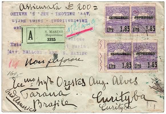 SAN MARINO - 1926, 1,85 su Espresso da 60 c. (129) 2 coppie su assicurata da 200 lire diretta a Curityba in Brasile, novembre 1926. Busta non molto fresca ma decisamente di pregio.(LETTERA)