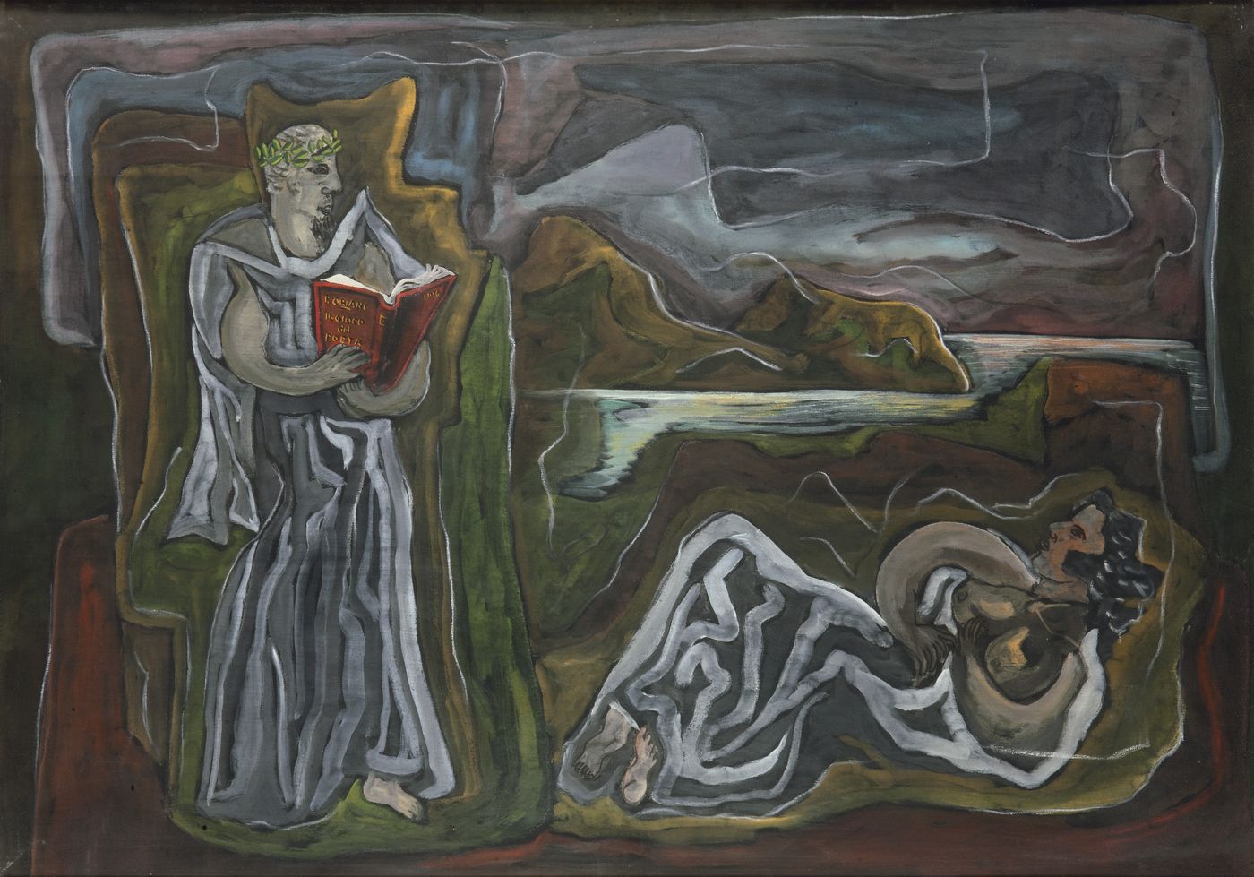 ORIANI PIPPO (Torino 1909 - 1972 Roma) - "Il gioco dei poeti" 1936, 70x100 tempera su tela. Opera firmata e datata in basso a destra. Esp.: 1939,Palazzo Lascaris, Torino, Mostra Personale. Già Accademia Tiberina, Roma (etichetta al retro); Già Galleria Il Punto, Torino (etichetta al retro)