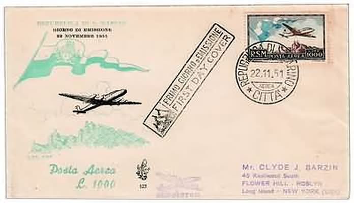 Lotto 4056 | SAN MARINO - 1951, Posta aerea, 1000 lire "Bandierone" (99) su FDC Venetia...