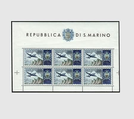 SAN MARINO - 1954, Foglietti, Aereo, Veduta e Stemma (16). Leggera grinza, lontana dai francobolli.(GOMMA INTEGRA)