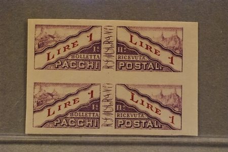 SAN MARINO - 1928, Pacchi postali, 1 lira non dentellato (8e) coppia...