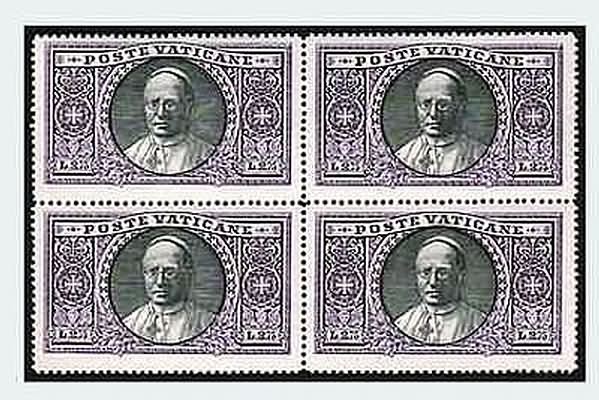 VATICANO - 1933, Giardini e medaglioni 18 valori cpl. (19/34+E.) centrati, in quartine.(GOMMA INTEGRA)