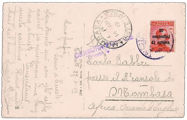 TERRE REDENTE - 1919, TRENTO E TRIESTE, 20 c. su 20 c. (5) su cartolina da Trieste per Mombasa, con timbro di arrivo. Destinazione decisamente rara, forse unica.(LETTERA)