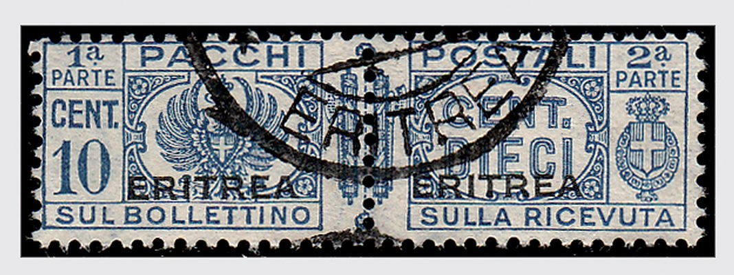 ERITREA - 1927, Pacchi postali, 10 c. azzurro "fascio" con soprastampa grande (22). (Cert. Raybaudi).(USATO)
