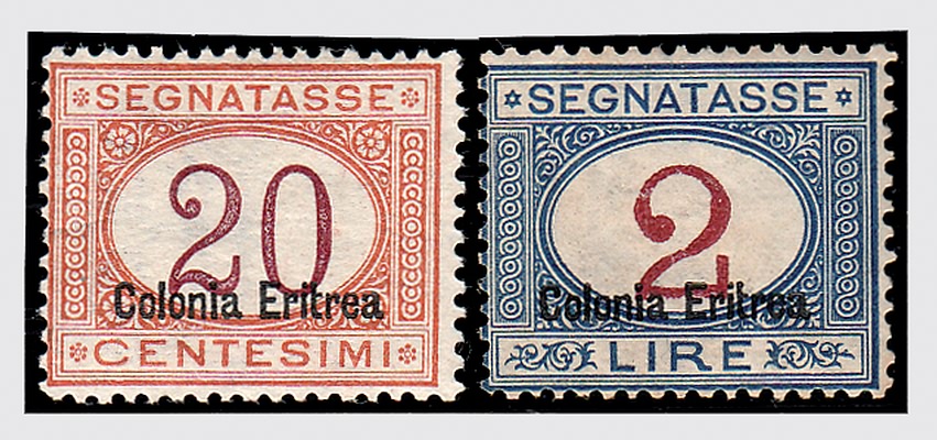ERITREA - 1925, Segnatasse, soprastampa in basso, 11 valori cpl. (14/24). (alti valori Cert.R.Diena).(GOMMA INTEGRA)