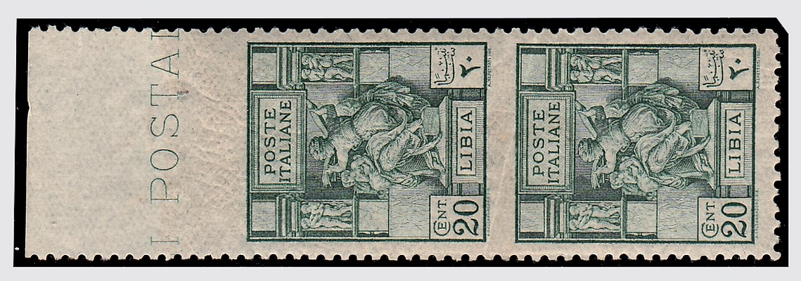 LIBIA - 1926, Sibilla 20 c., coppia verticale non dentellata in alto e al...