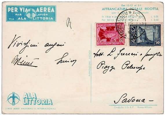 POSTA AEREA - 1939, EGEO, cartolina della Ala Littoria prestampata per "Affrancatura totale ridotta (per 5 parole e convenevoli)", valida dal 15/12 al 5/1, affrancata con Pittorica 5 c. + 30 c. (56+60) da Rodi per Savona, 20/12/39. Decisamente non comune.