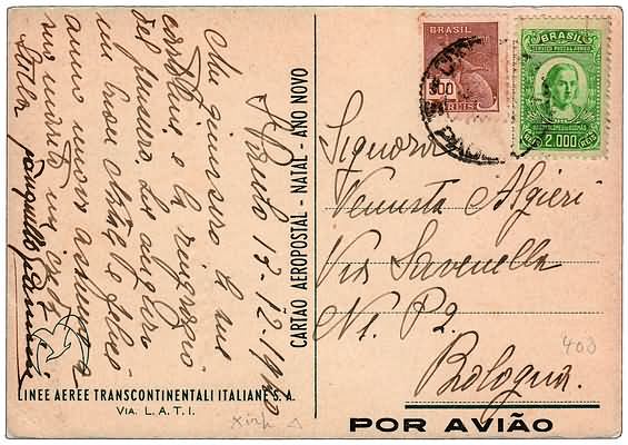 POSTA AEREA - 1940, BRASILE, cartolina "Profilo di trimotore e caravella" con scritte "Boas Festas" (Longhi 40 CBc) da San Paolo per Bologna, 13/12/40, in tariffa ridotta di 2500 r., via L.A.T.I.(LETTERA)