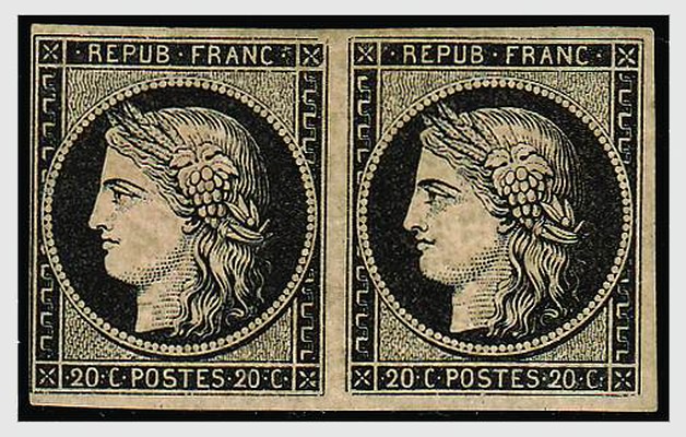 FRANCIA - 1849, Cerere 20 c. nero su giallo (3) coppia. (Cert. E....