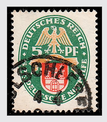 GERMANIA IMPERO E REICH - 1928, Stemmi 5+5 p. Amburgo, con filigrana verticale (416a) (Michel 425X). Raro. (Cert. Caffaz).(USATO)