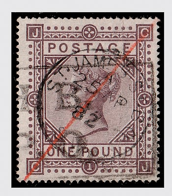 GRAN BRETAGNA - 1878, 1 sterlina bruno lilla (42) annullata. Leggera piega verticale. (Cert. Raybaudi).(USATO)