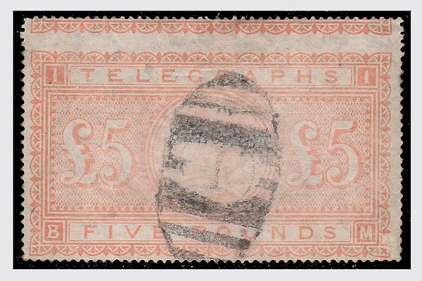 GRAN BRETAGNA - 1870, Telegrafo, 5 £ rosso arancio (11). Esemplare sbiadito...