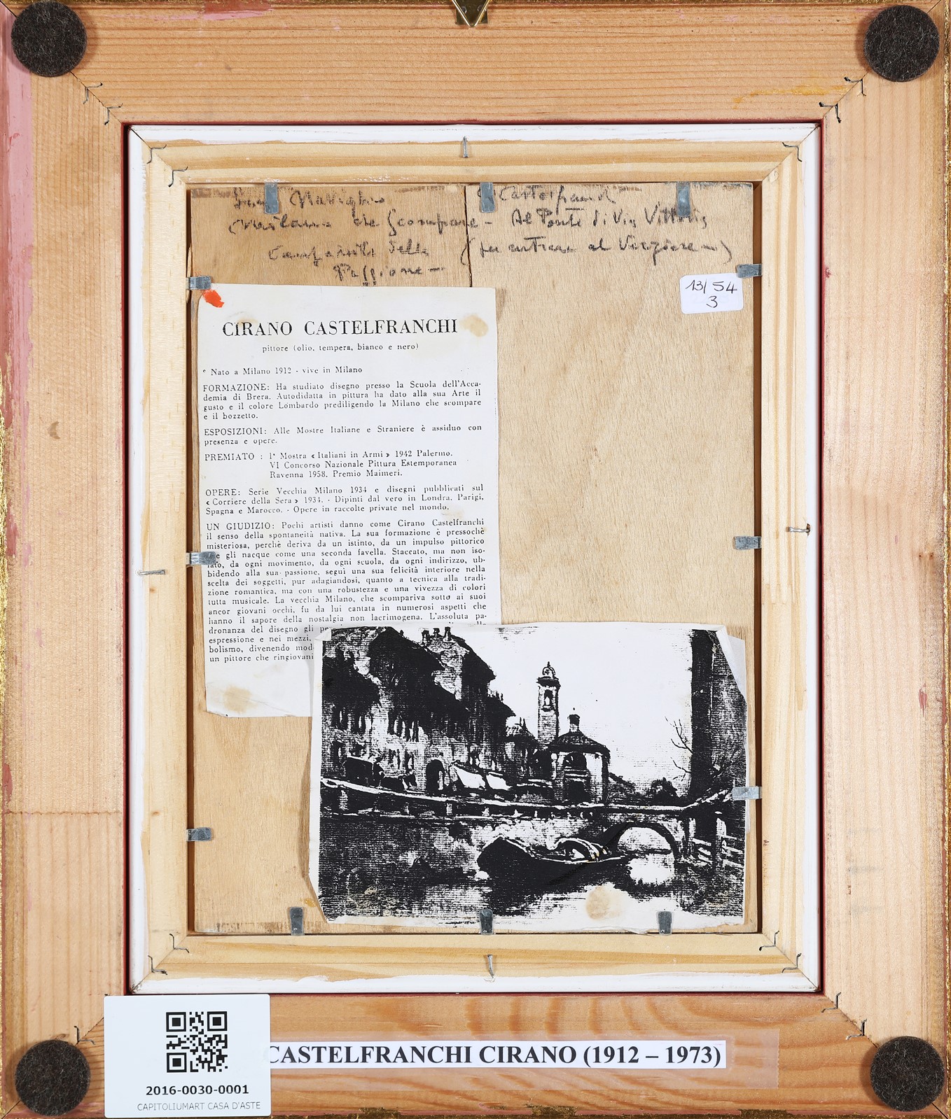 CASTELFRANCHI CIRANO (n. 1912) Al ponte di via Vittoria. 1930. Olio su tavola. Cm 18,00 x 24,50. Firma e anno in basso a destra. Al retro firma e titolo. Cornice presente