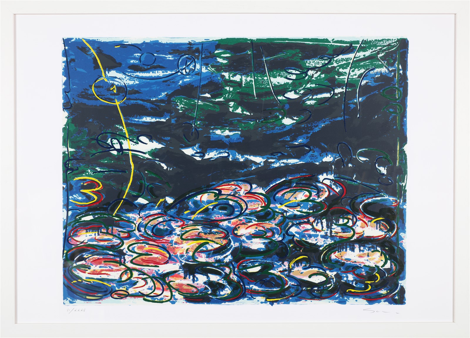 SCHIFANO MARIO (1934 - 1998) Gigli d'acqua. Litografia. Cm 100,00 x 70,00. VI/XXXV. Tiratura e firma a matita in basso e timbro Mastrogiacomo Editore, Padova in basso a sinistra. Cornice presente