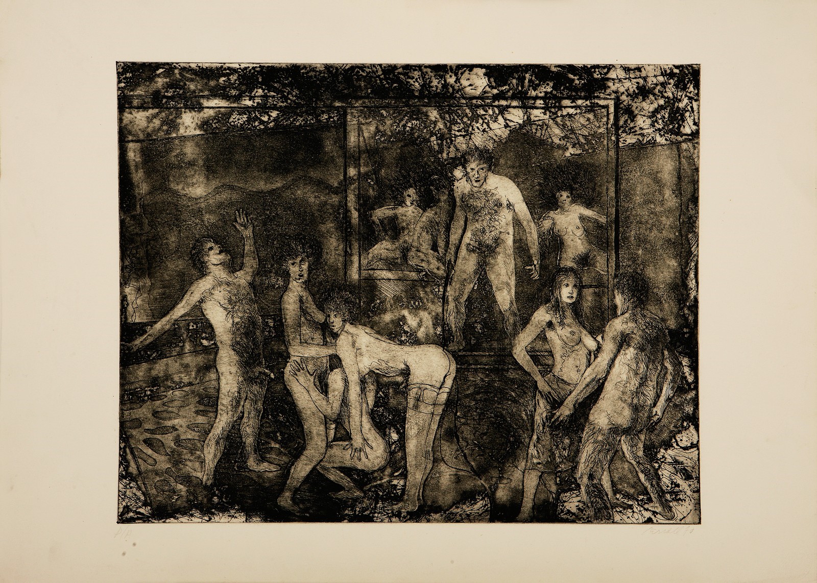 CARROLL ROBERT (n. 1934) Senza titolo. 1970. Acquaforte e vernice molle.. Cm 70,00 x 50,00. P.d.a. Tiratura, firma e anno a matita in basso. Dimensione lastra: 39 x 49,5 cm. Timbro a secco in basso a destra Il Minotauro, Livorno.
