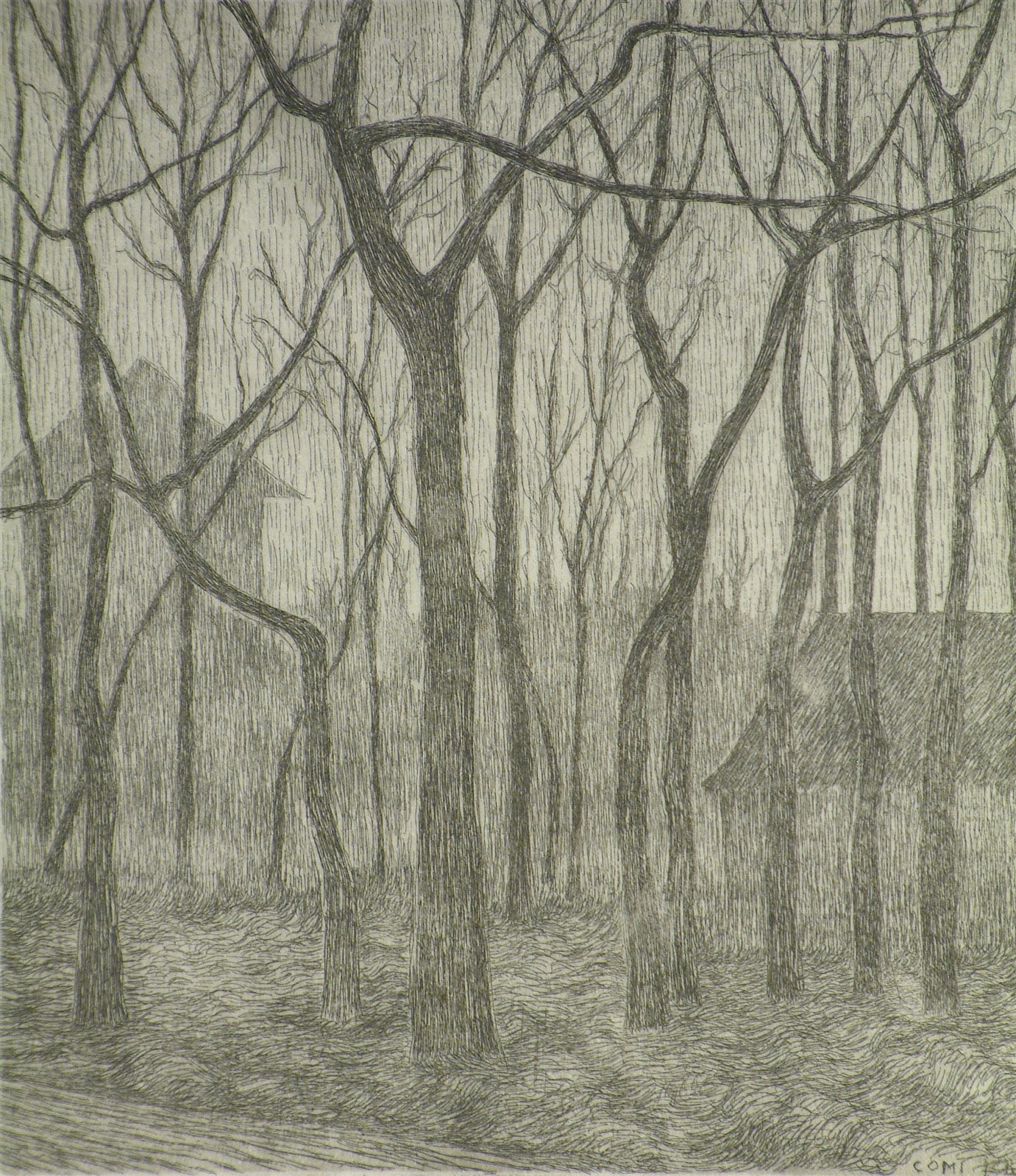 COMI FULVIO (1922 - 1999) Inverno alla periferia di Monza. 1974. Acquaforte. Cm 35,00 x 50,00. 56/60. Firma e anno in basso a destra. Dimensione lastra: 17 x18 cm.