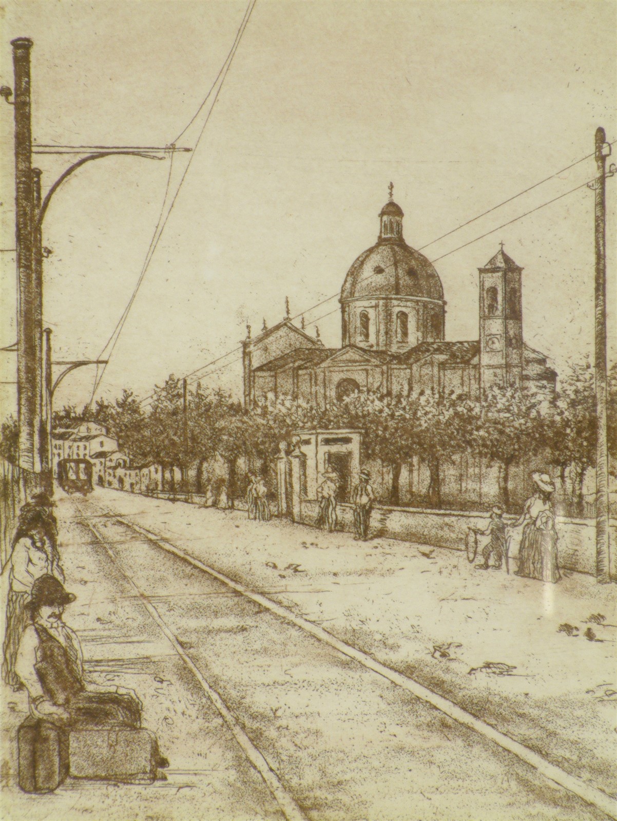 CORBANI MAURO (n. 1952) Montichiari, La Basilica. 1986. incisione ad acquaforte e puntasecca. Cm 25,00 x 35,00. 15/100. Firma in basso a sinistra. Dimensione lastra: 12 x16 cm.