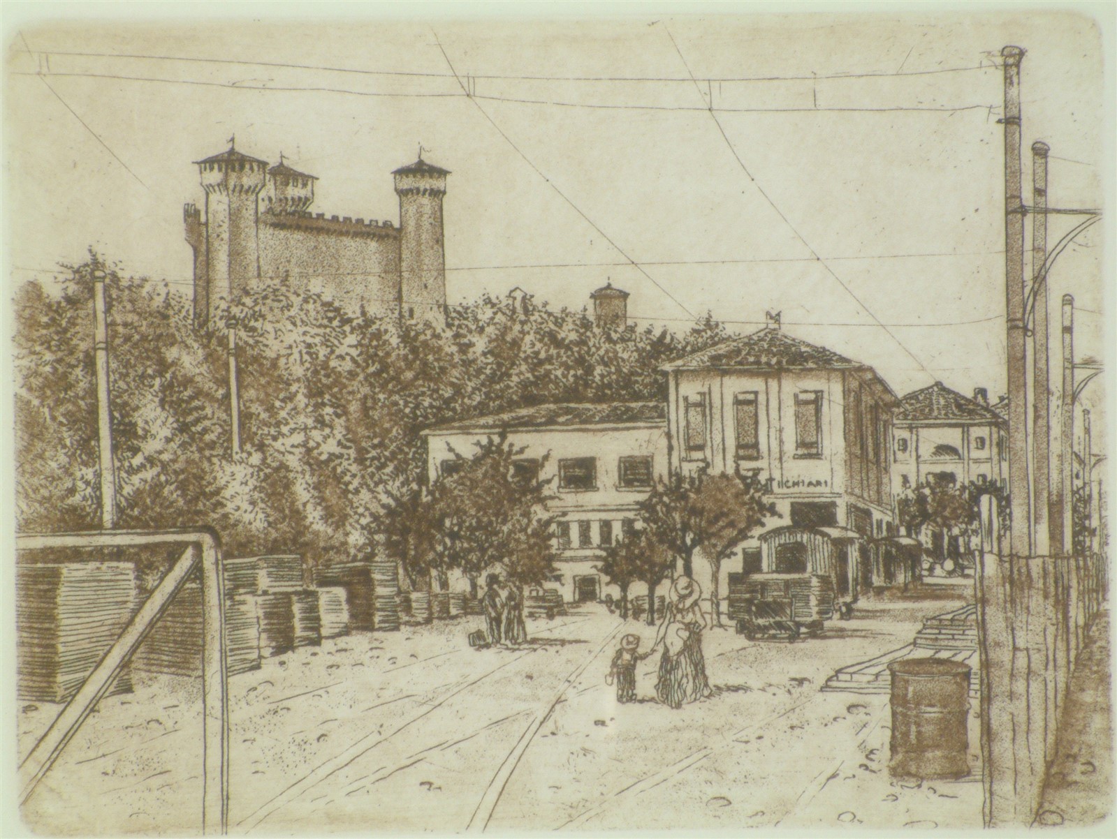 CORBANI MAURO (n. 1952) Montichiari: castello e stazione. incisione ad acquaforte e puntasecca. Cm 35,00 x 25,00. 15/100. Dimensione lastra: 16,5 x12 cm.