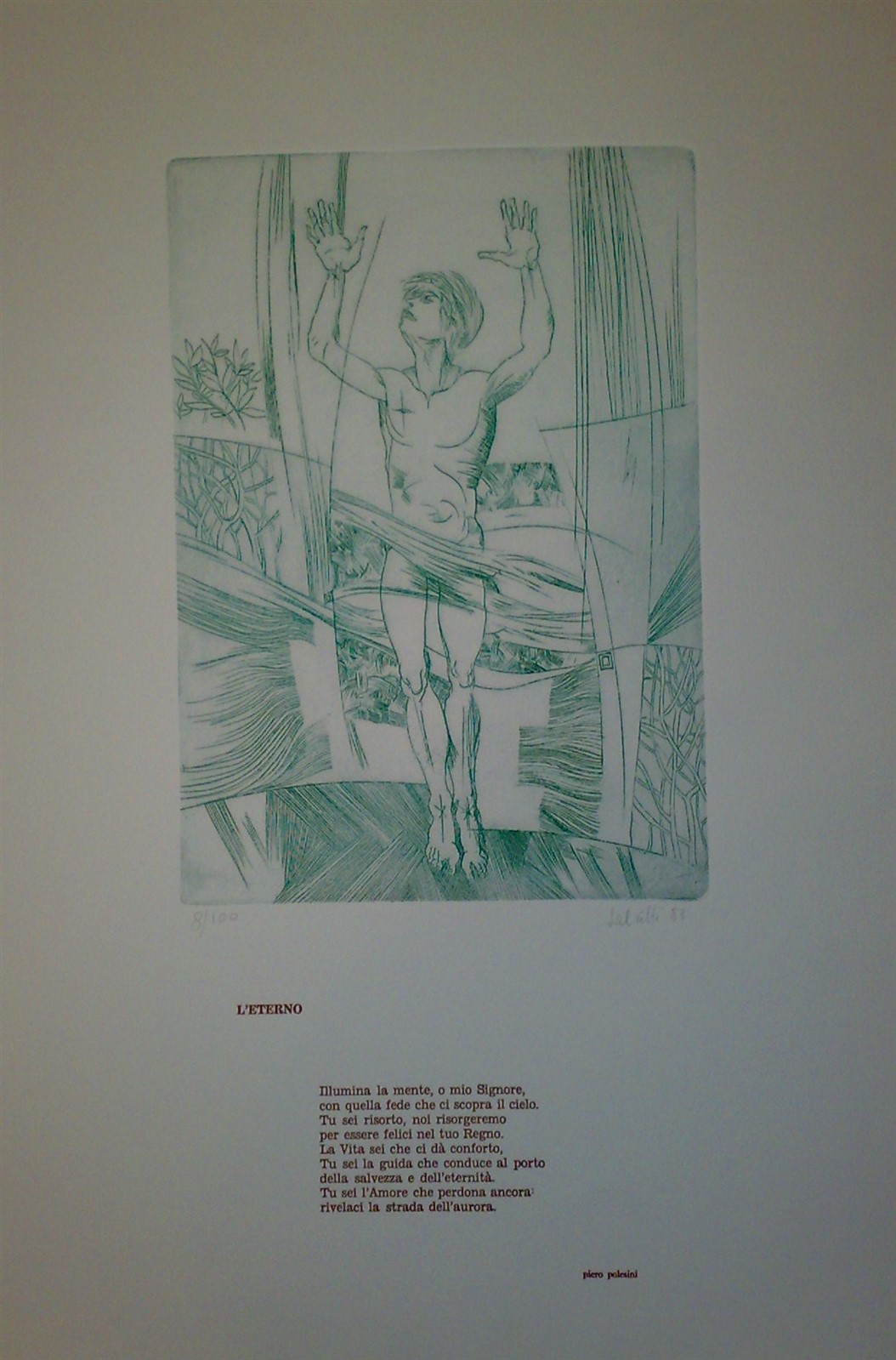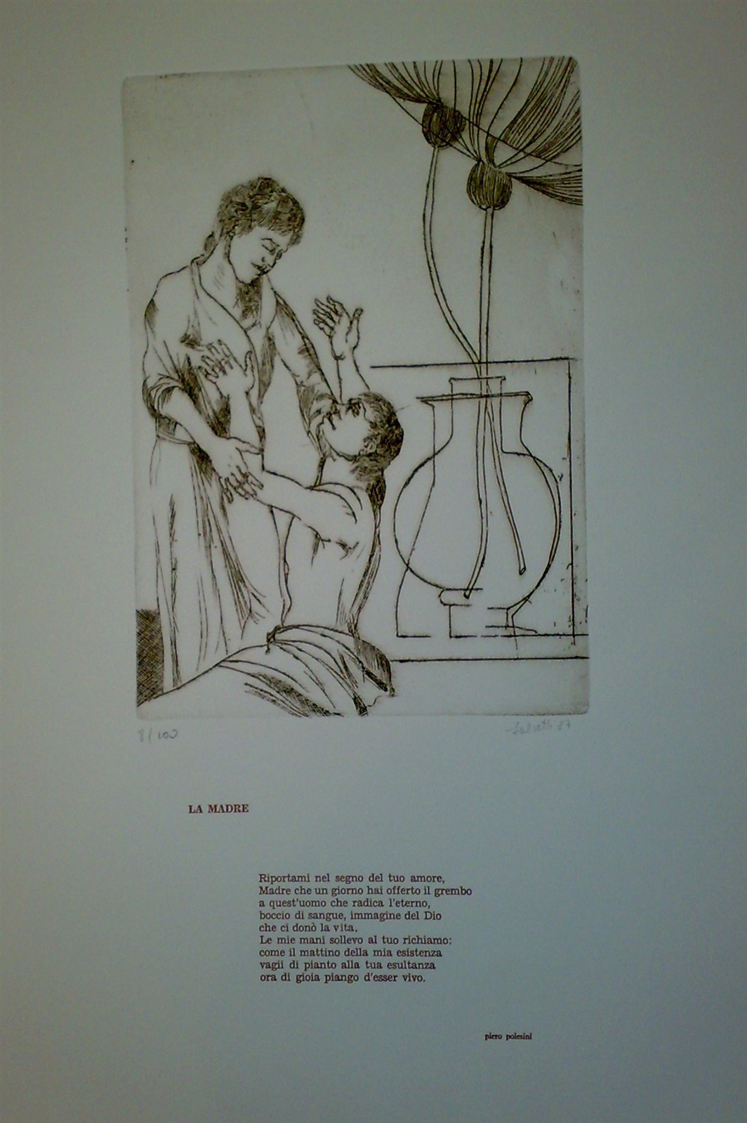 SALVETTI LUIGI (n. 1939) Cartella composta n.5 grafiche con poesie di Piero Polesini. Acquaforte. Cm 34,00 x 49,00. 8/100. Tiratura effettuata nel 1983 presso il Convento Santa Maria degli Angeli di Soiano (Bs) da frate Pierangelo Pagani e Valentino Ungaro. Dimensione lastra: 17,5 x 24,5 cm.