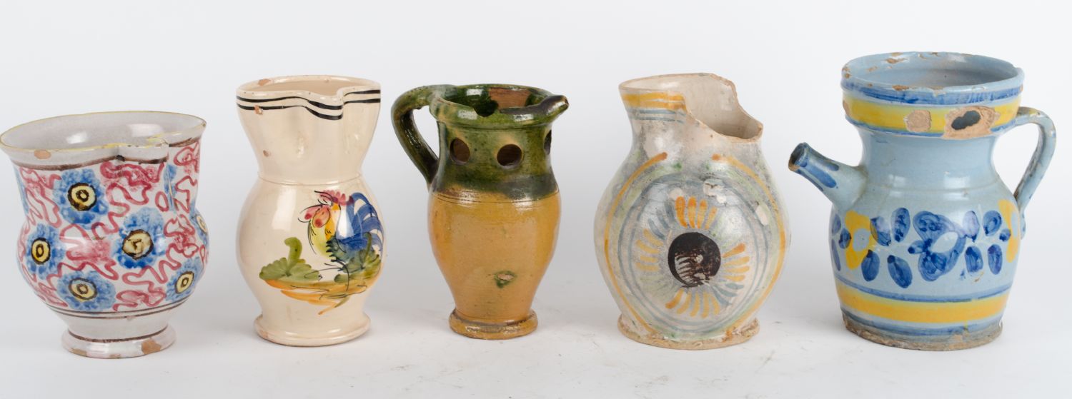 CINQUE VERSATOI in ceramica smaltata e decorata. Italia XIX secolo Misure: h...