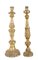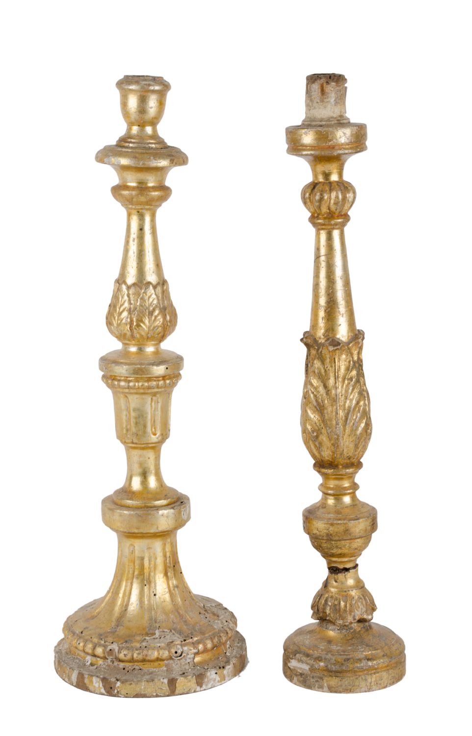 DUE CANDELIERI in legno dorato ad argento a mecca. Sicilia meta' '800 Misure: h cm 48
