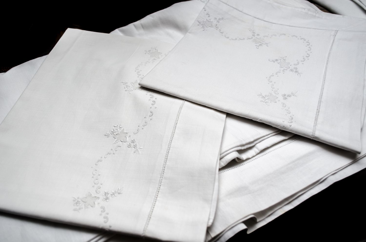 LENZUOLO matrimoniale con due FEDERE in cotone bianco ricamato.