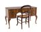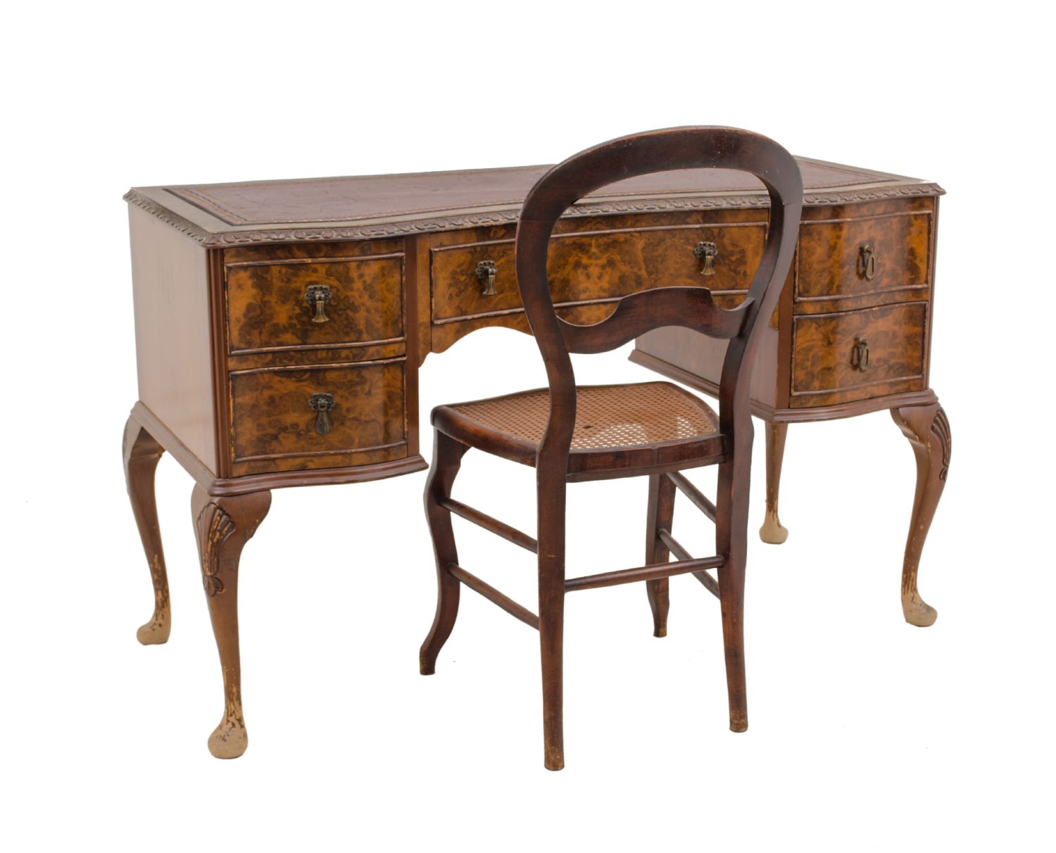 SCRITTOIO stile barocco in radica di noce a cinque cassetti con SEDIA stile Luigi Filippo con seduta in finocchino. XX secolo Misure: cm 120 x 52 x h 65