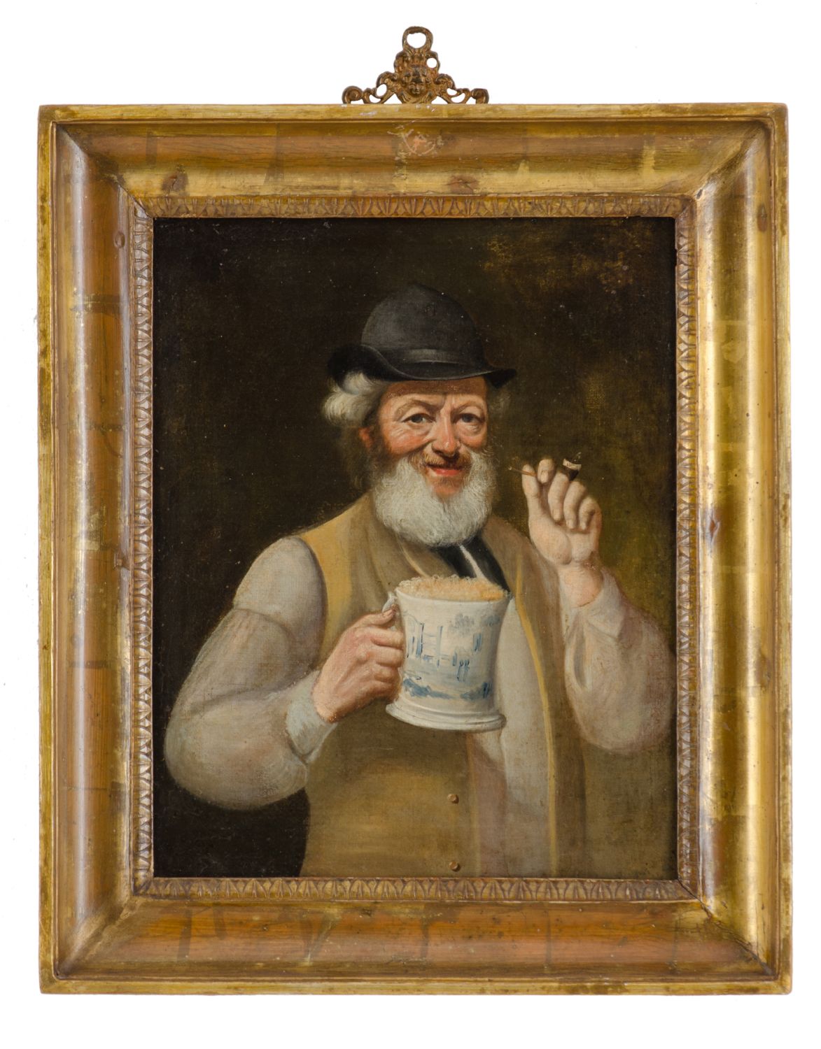 OLIO su tela "bevitore di birra" entro cornice coeva a canna ciaccata in legno dorato ad argento a mecca. XIX secolo Misure: cm 31 x 38,5