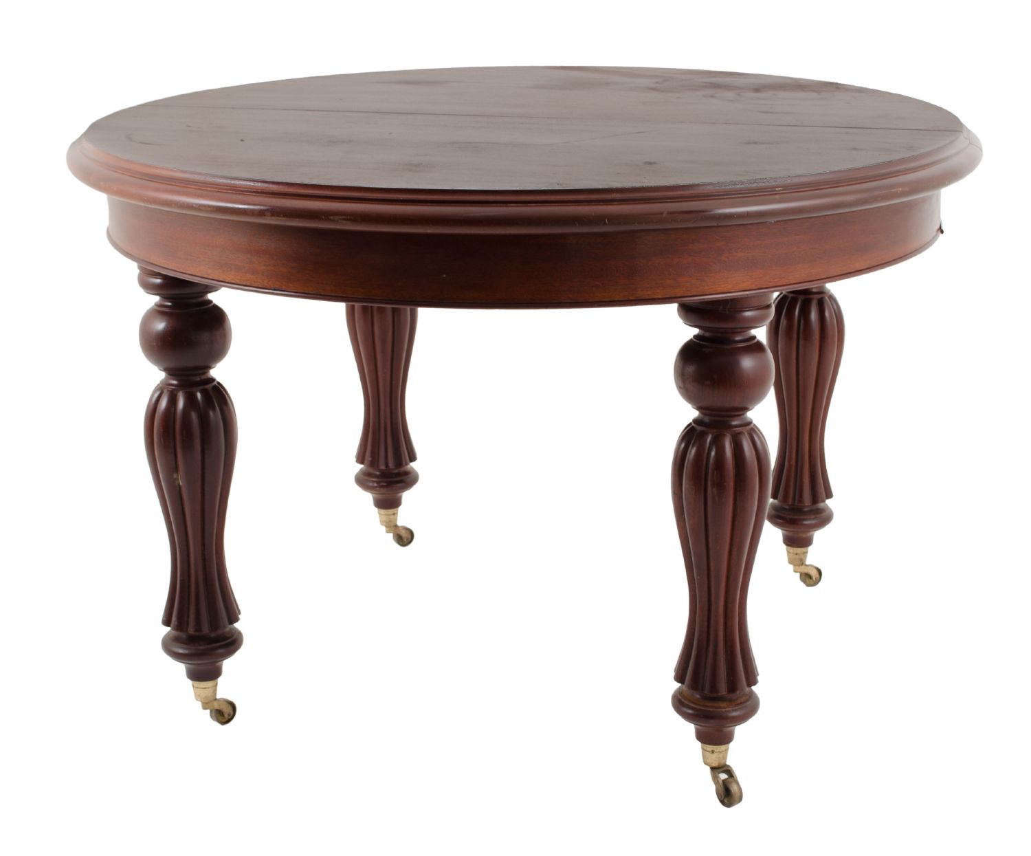 TAVOLO da pranzo allungabile in mogano stile Vittoriano (con 2 prolunghi). XX secolo Misure: diametro cm 125 x h 81