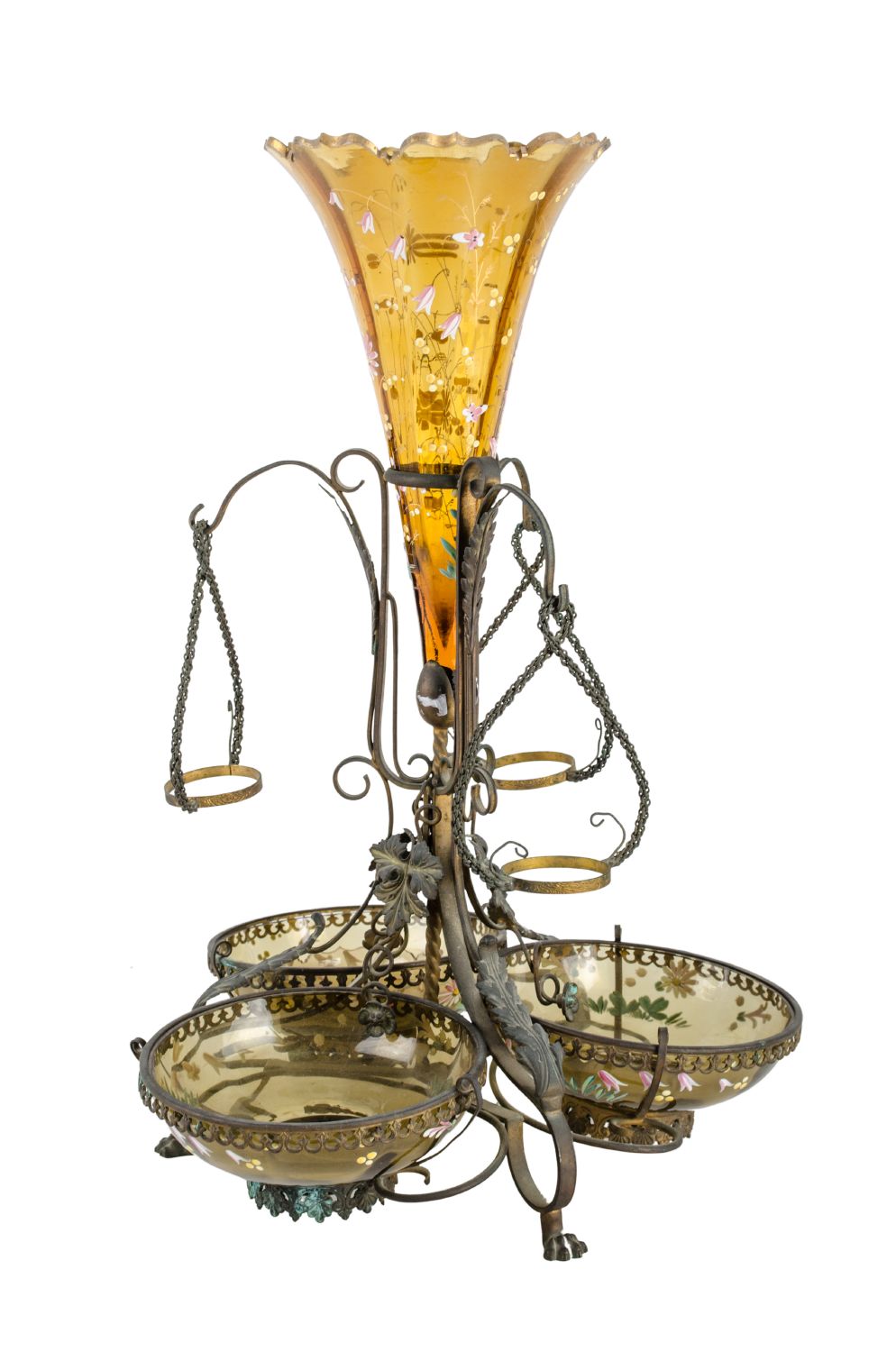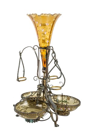 FIORIERA in ottone e vetro dipinto a mano. Sicilia primi '900 Misure: h cm 54