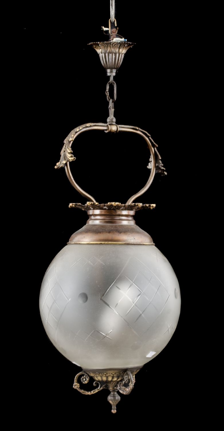 LAMPADARIO a due luci in ottone con boccia in vetro. XX secolo Misure: h cm 85