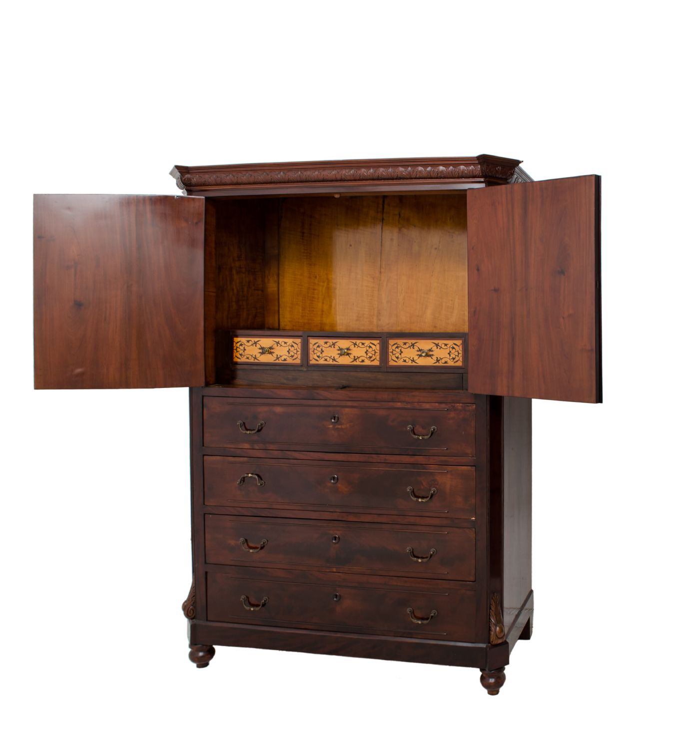 CHIFFONIERE in mogano e piuma di mogano con due sportelli e 4 cassetti, cassettiera interna (usure). Sicilia XIX secolo Misure: cm 140 x 61 x h 190