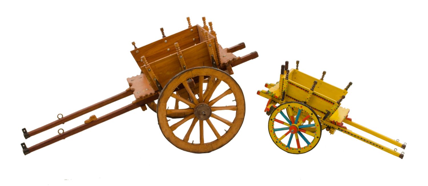 DUE CARRETTINI siciliani in legno (uno dipinto). XX secolo Misure: varie