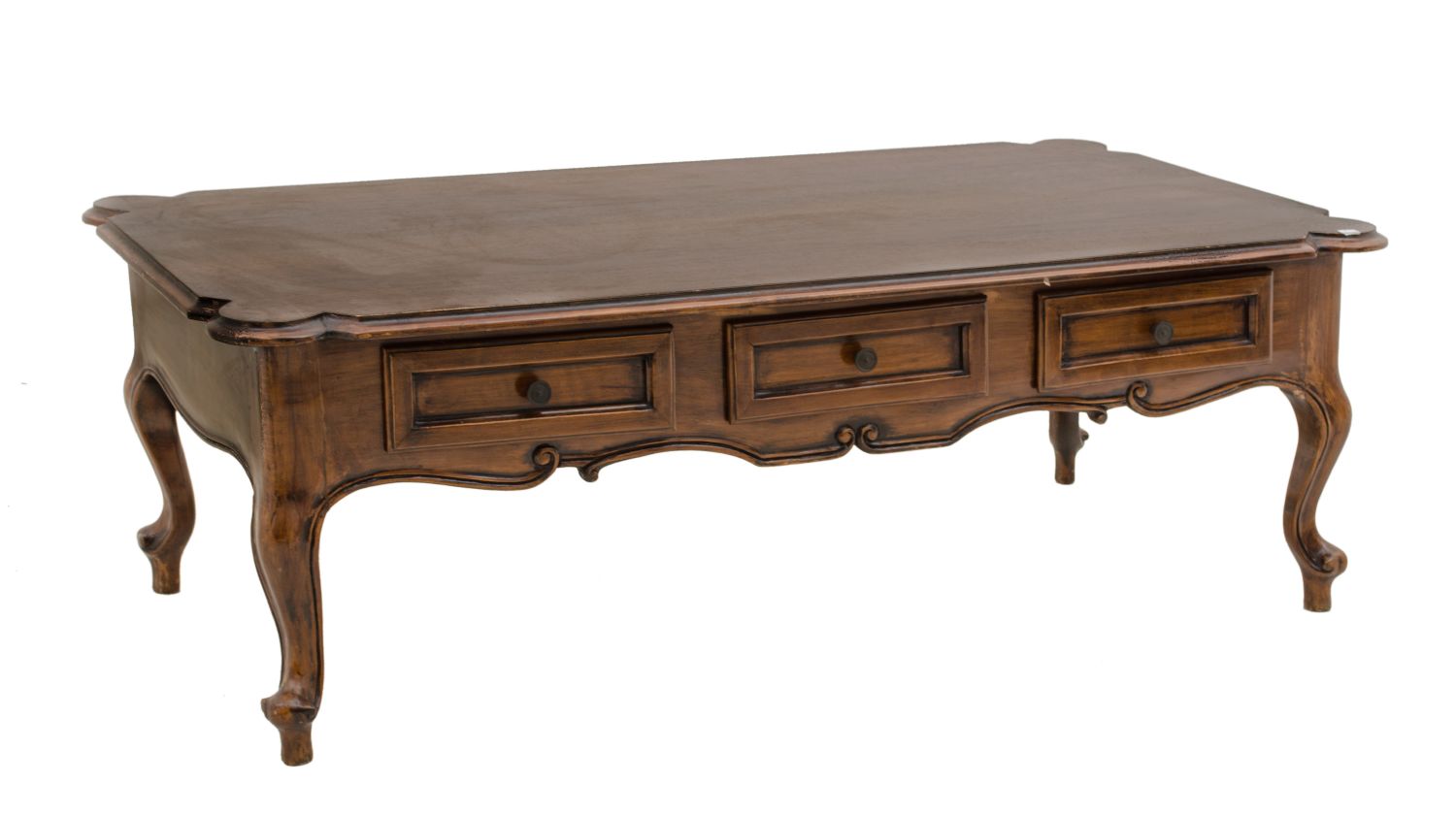 TAVOLINO da salotto in noce a tre cassettini. XX secolo Misure: cm 138 x 70 x h 47