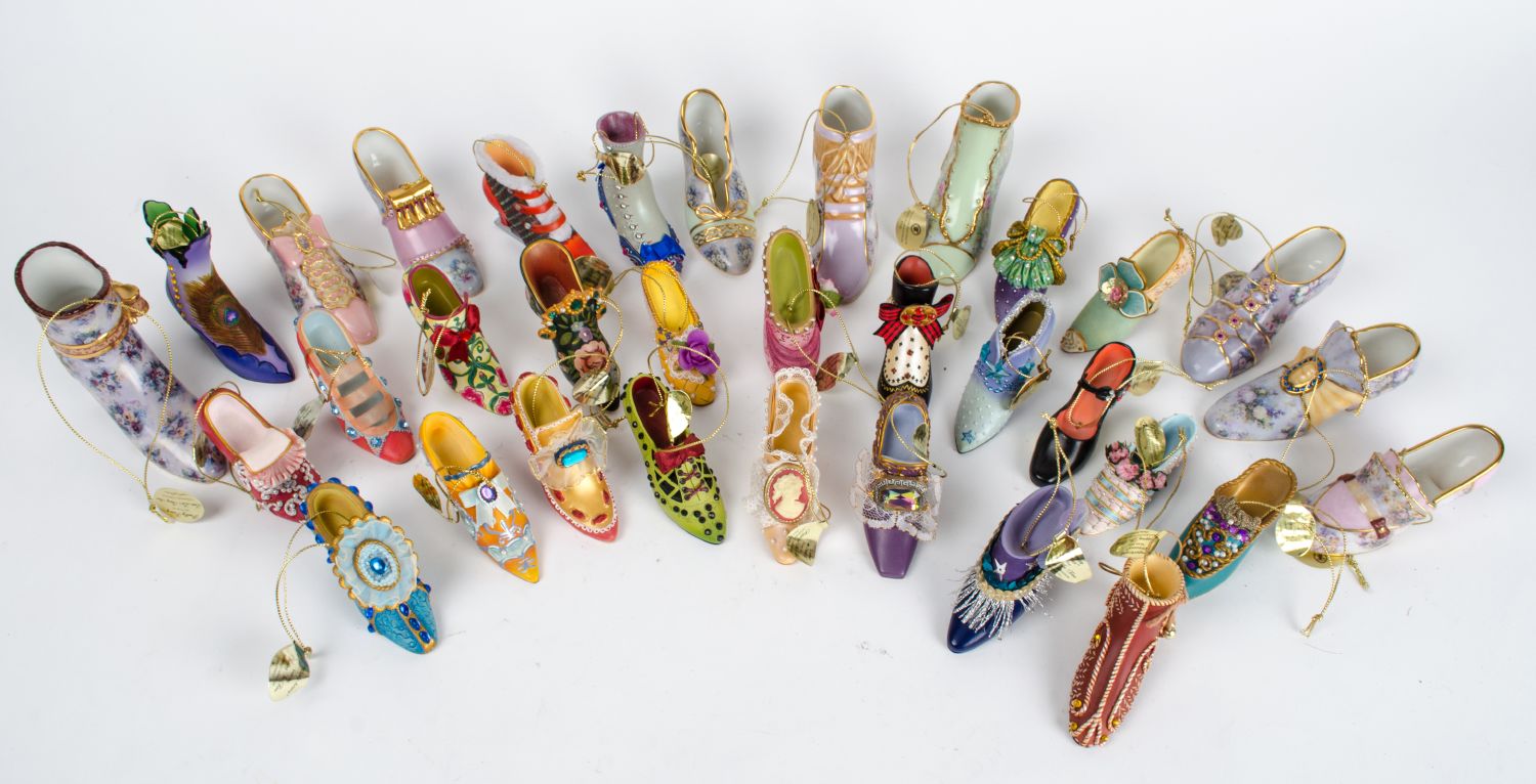 COLLEZIONE composta da 33 SCARPETTE in porcellana policroma (usure). XX secolo Misure: varie