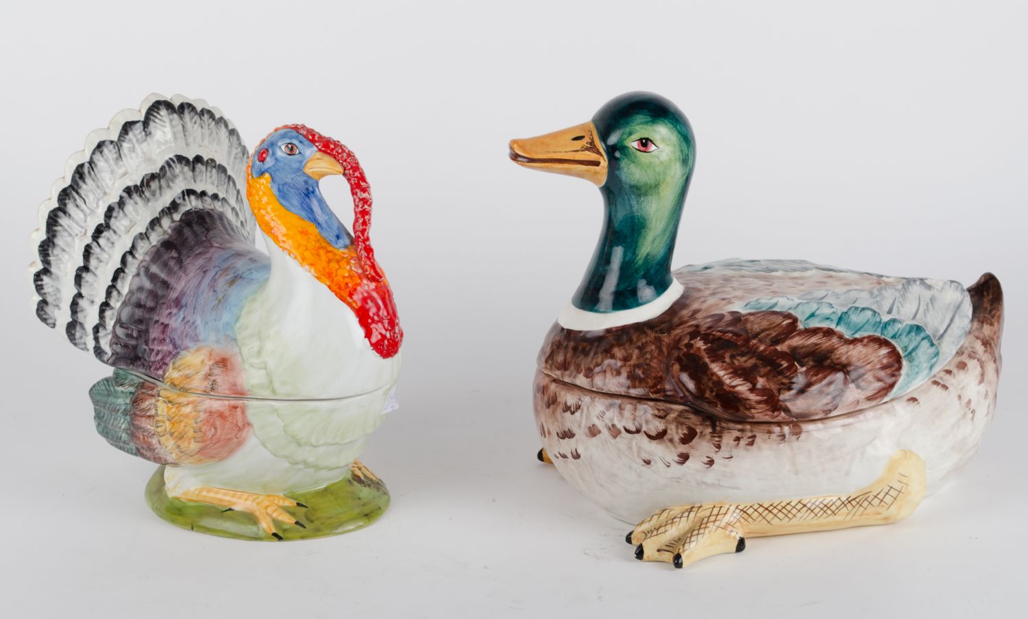 DUE CONTENITORI in ceramica dipinta raffiguranti "anatra" e "tacchino". XX secolo Misure: varie