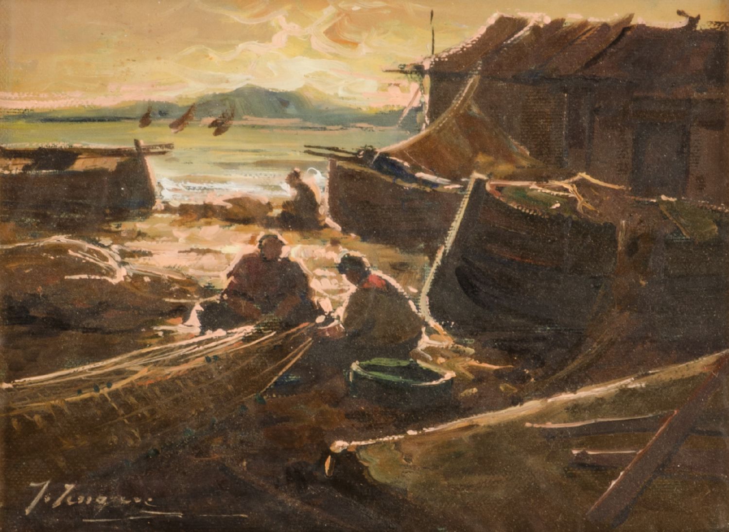 FRANCO FERRARESE OLIO su tela "pescatori con barche a secco". XX secolo Misure: cm 24 x 18