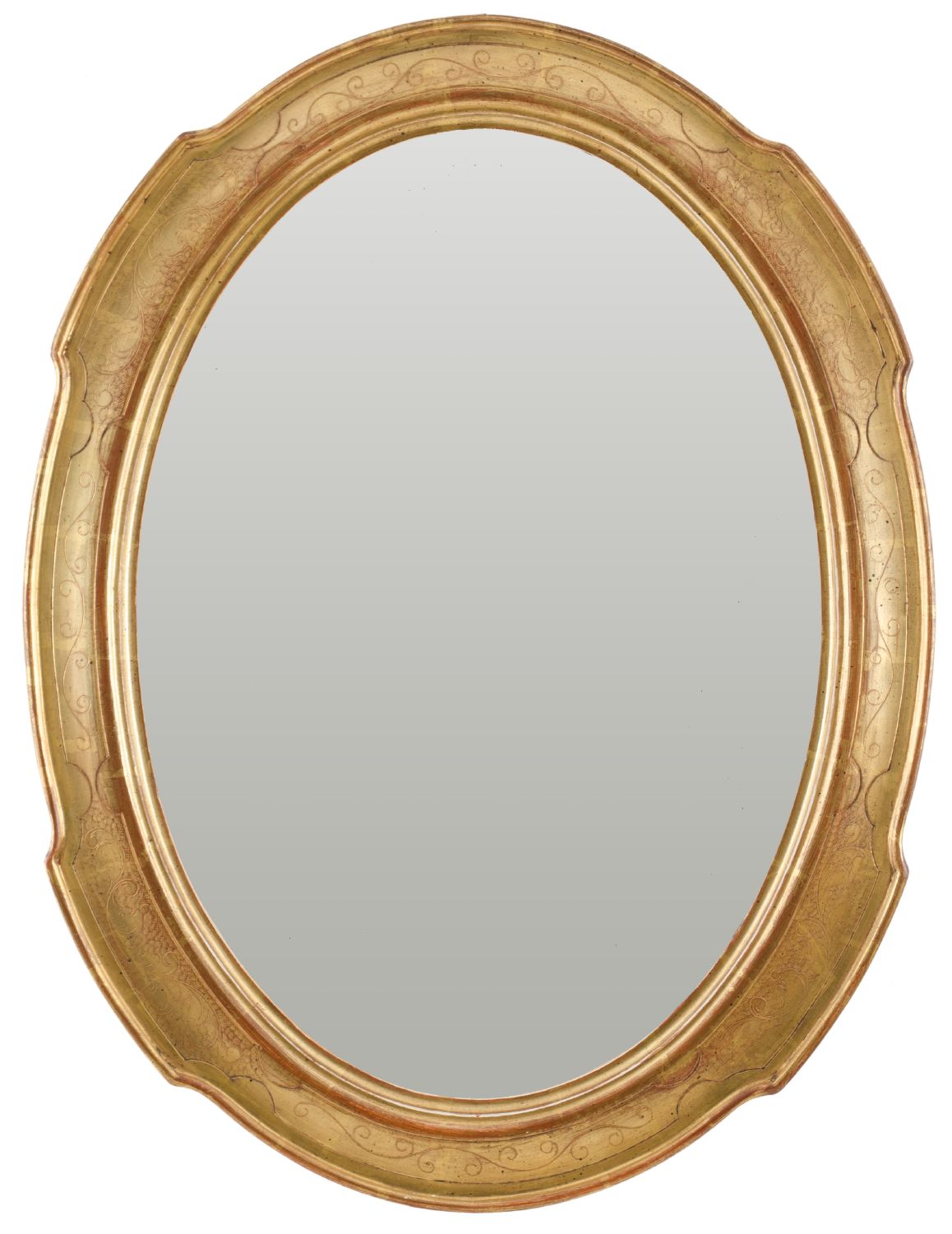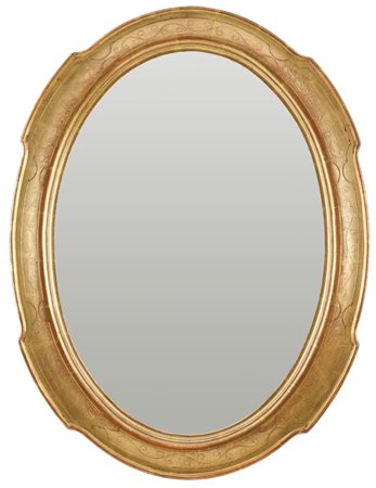 SPECCHIERA ovale in legno dorato ed inciso. XX secolo Misure: cm 65 x 85