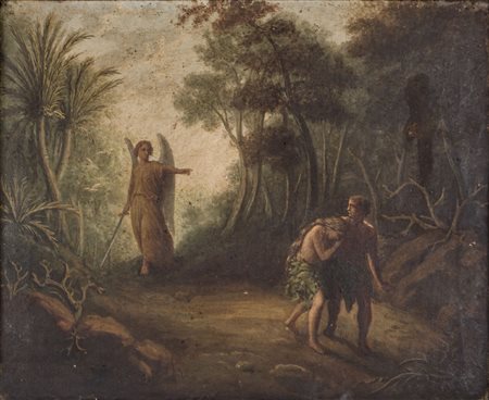 OLIO su tela "Adamo ed Eva cacciati dal Paradiso terrestre". XX secolo Misure: cm 26 x 22