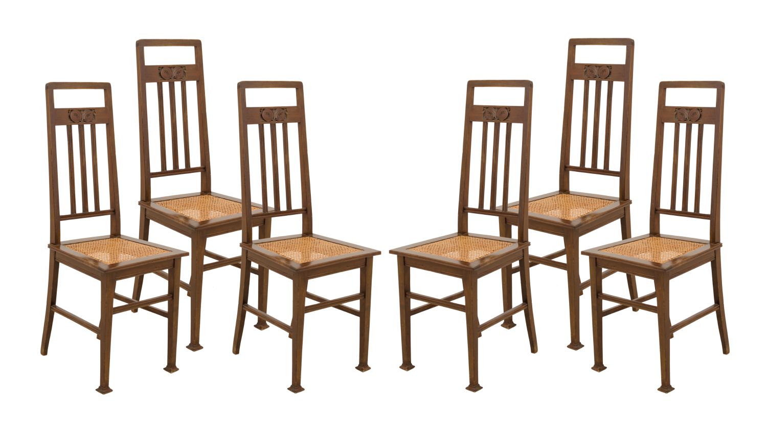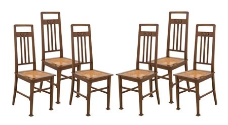 SEI SEDIE Liberty in faggio con seduta in finocchino (seduta h cm 45,5). Sicilia primi '900 Misure: h cm 107