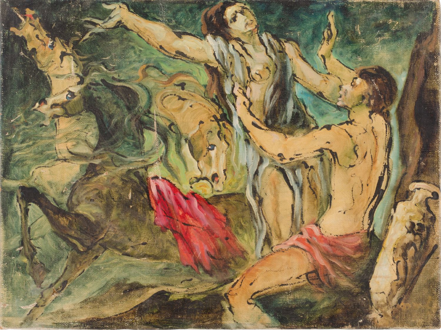 RODOLFO ZITO (Molochio (Rc) 1924 - Roma 1995) OLIO su tela grezza "figura con cavalli". Misure: cm 80 x 60