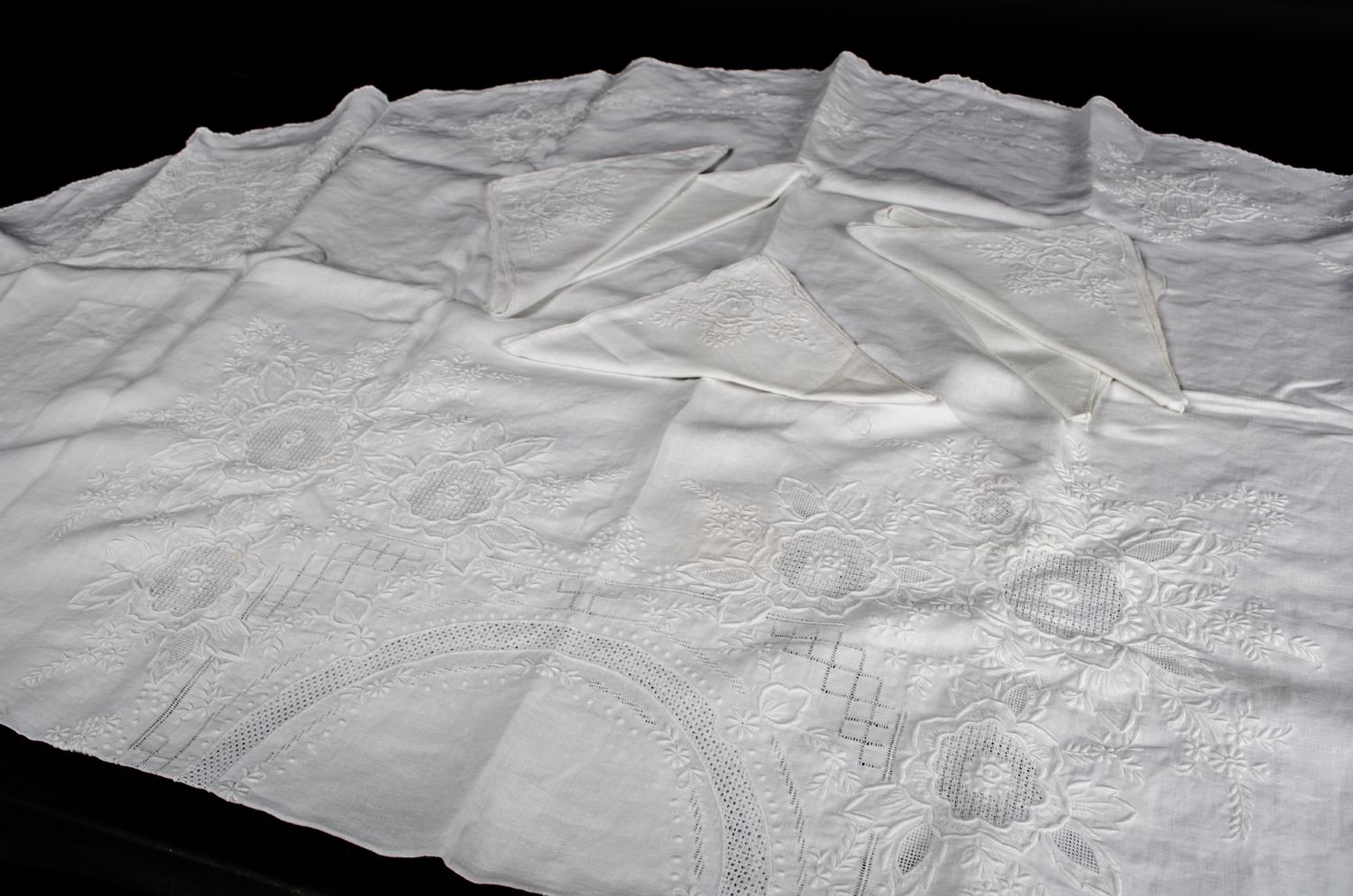 TOVAGLIA tonda con cinque TOVAGLIOLI in lino con ricami (difetti).