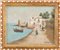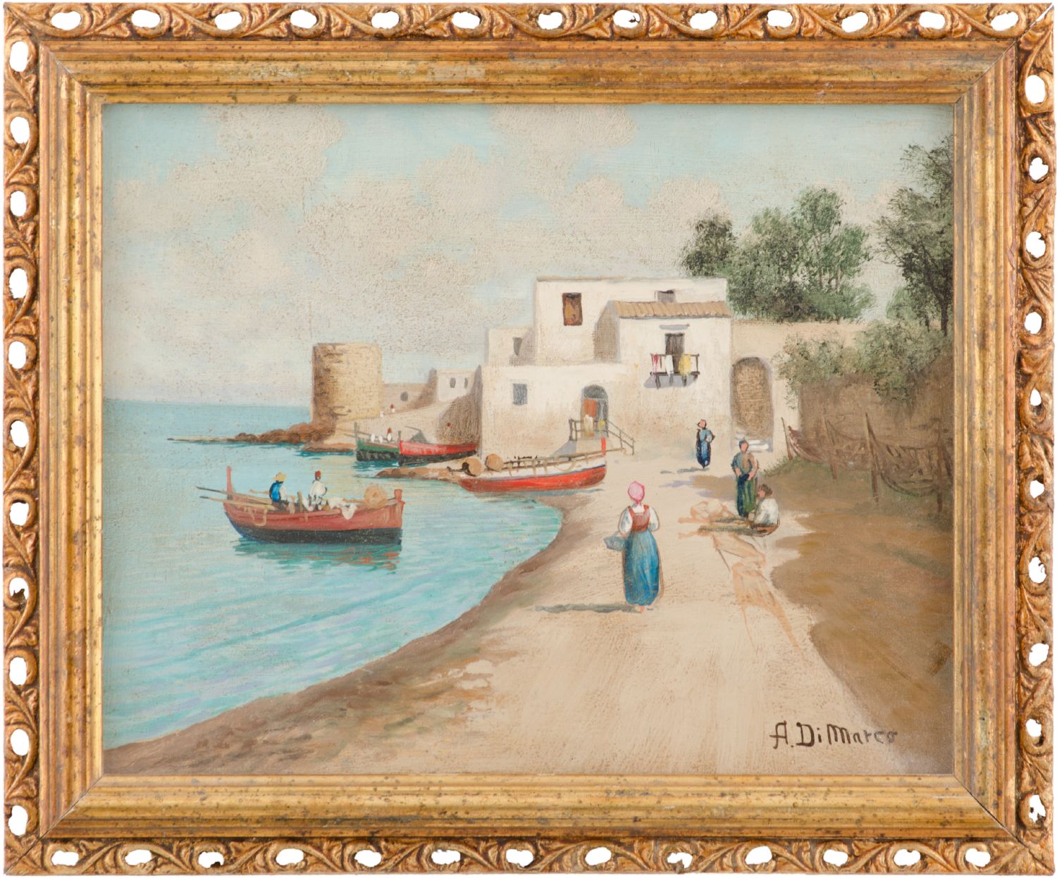 OLIO su tavola "paesaggio costiero con personaggi". XX secolo Misure: cm 30 x 24