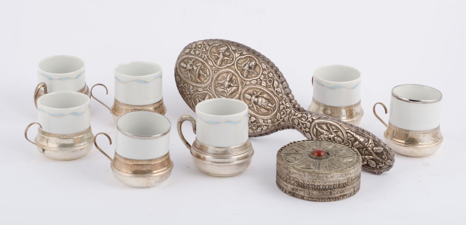LOTTO composto da COFANETTO in metallo sbalzato, SPECCHIO, 4 TAZZE in porcellana Bavaria ed argento e da 4 TAZZE in porcellana ed argento. XX secolo Misure: varie