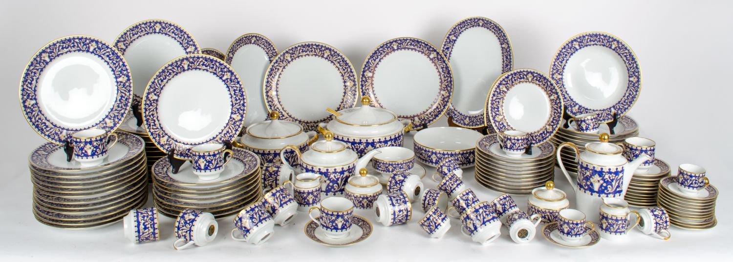 SERVIZIO in porcellana Limoges con bordi decorati: ZUPPIERA, INSALATIERA, SALSIERA con mestolo, LEGUMIERA, 2 RAVIERE, 5 PIATTI da portata, 12 PIATTI fondi, 35 PIATTI piani, 11 PIATTINI da frutta, SERVIZIO da caffe' e SERVIZIO da the' per 12 persone. XX secolo Misure: varie