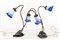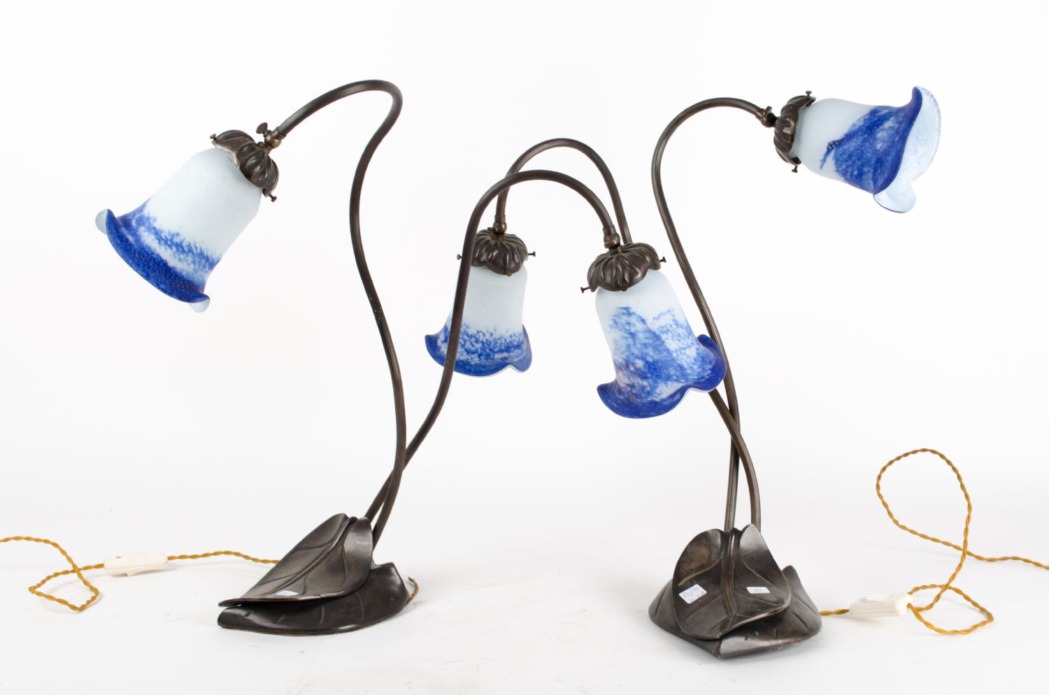 COPPIA LAMPADE stile Liberty a due fiamme in ottone brunito con bocce nei toni del bianco e del blu. Italia XX secolo Misure: h cm 50