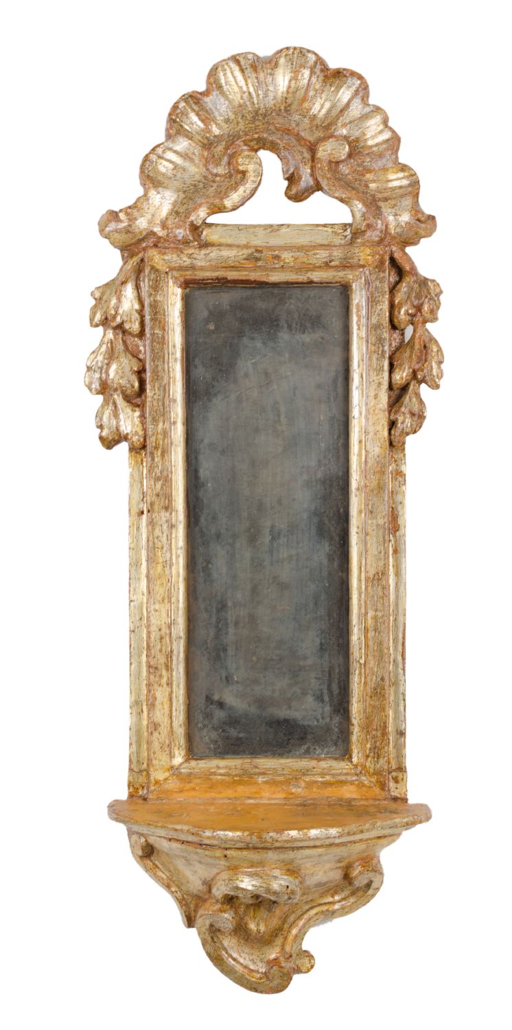 SPECCHIERINA/MENSOLA in legno intagliato e dorato ad argento a mecca. Sicilia XVIII secolo Misure: cm 22 x 10 x h 66