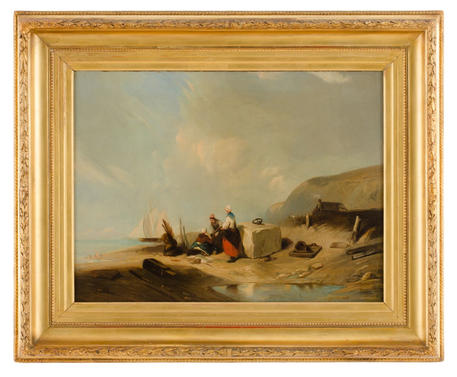 OLIO su tela "paesaggio marino con personaggi" entro cornice coeva in legno dorato ad oro zecchino. Francia XIX secolo Misure: cm 64 x 48